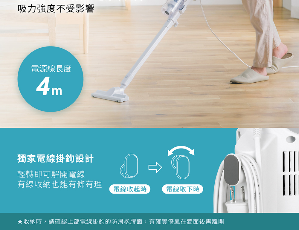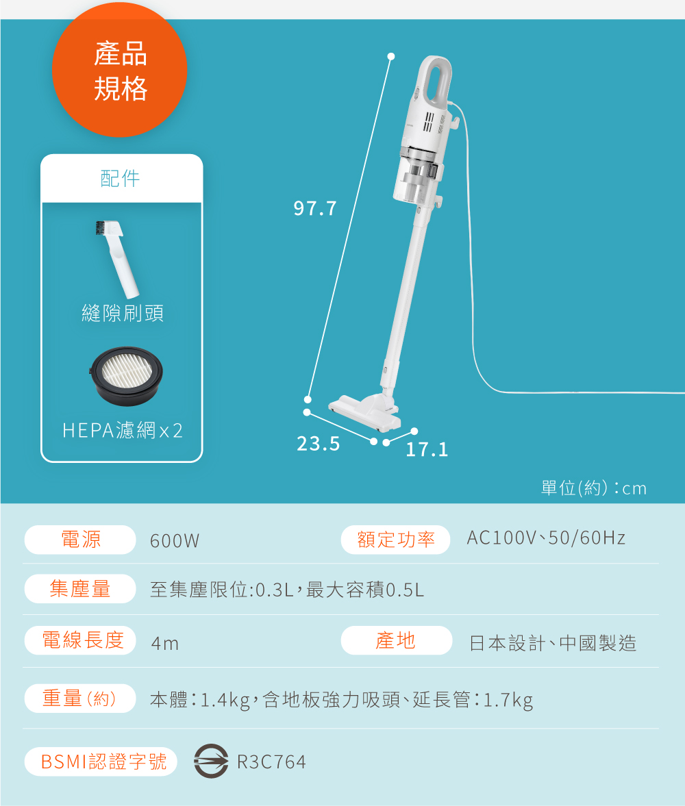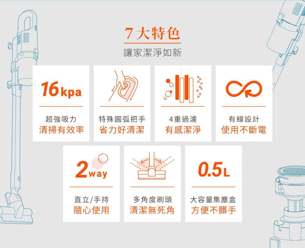 ‧ 有線設計讓使用時間變得無限制,吸力不減弱‧ 輕量1.7公斤卻有16KPa超強吸力‧ 特殊圓弧握把設計,何種狀況下都省力好推‧ 直立式、手持式2in1雙向機種,可依不同情境使用‧ 可水洗的集塵盒,使整體使用壽命大幅增長‧ 本體內附濾網x1,隨箱再附贈一個濾網