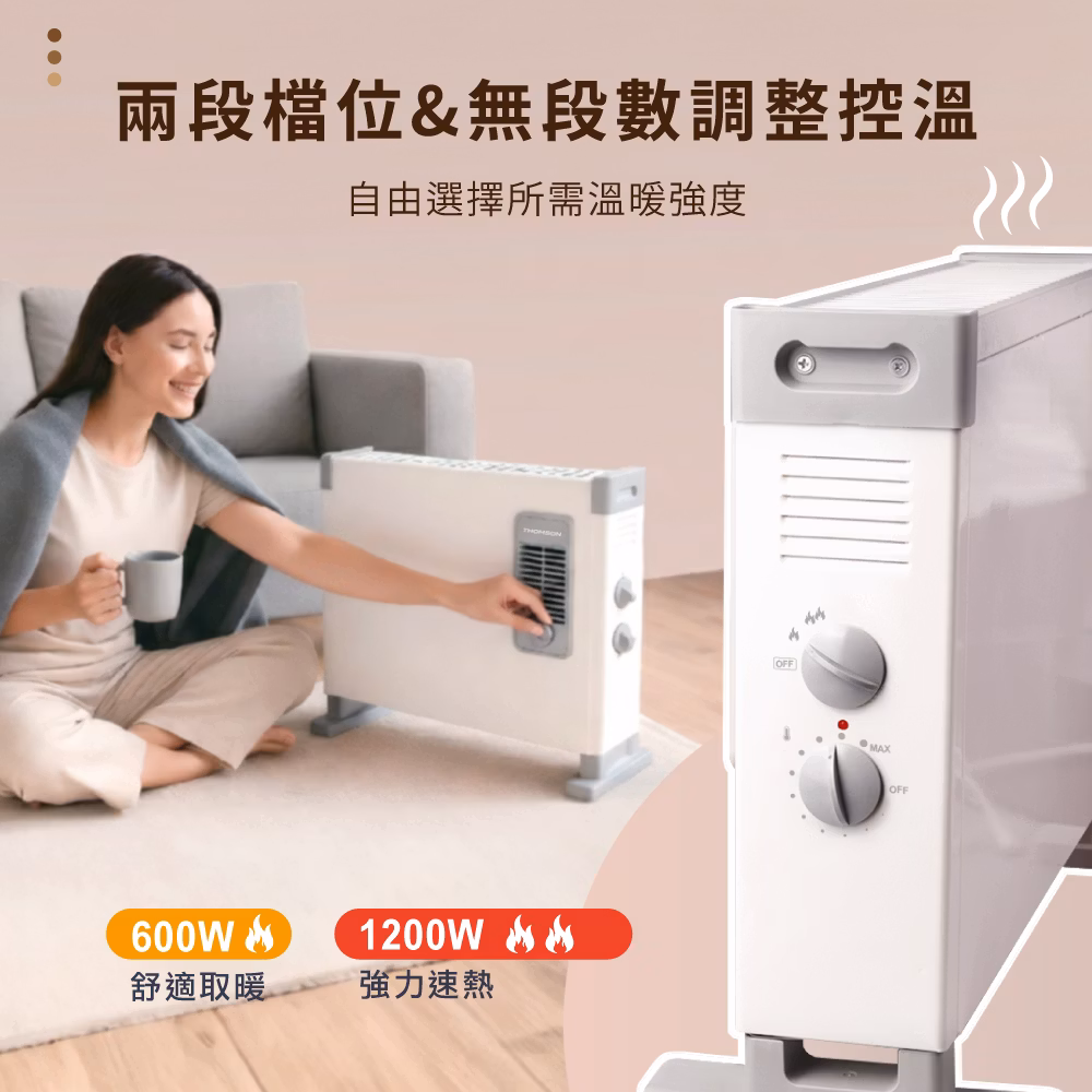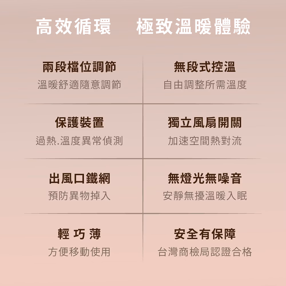 ◆兩段檔位調節,溫暖舒適隨意調節◆無段式控溫,自由調整所需溫度◆過熱保護裝置與溫度異常安全保護裝置◆增加出風口鐵網,預防異物掉入◆獨立風扇開關,可加速空間熱對流◆輕巧薄,方便移動使用◆台灣商檢局認證合格,安全有保障◆無燈光無噪音,全家適用