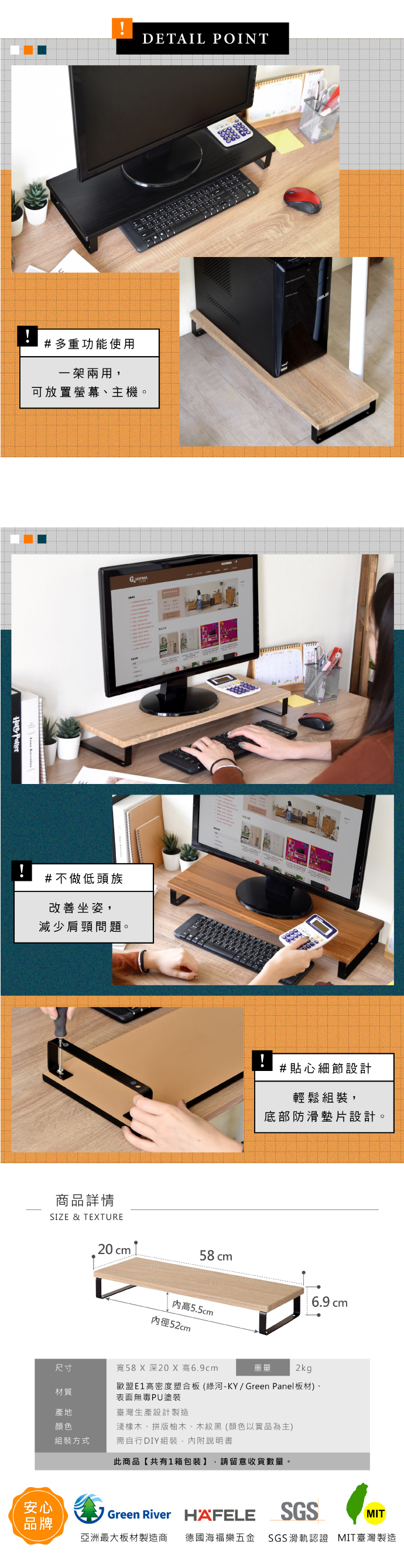 HOPMA工藝金屬底座螢幕增高架/E-5601PTK/寬58x深20x高6.9cm/拼版柚木