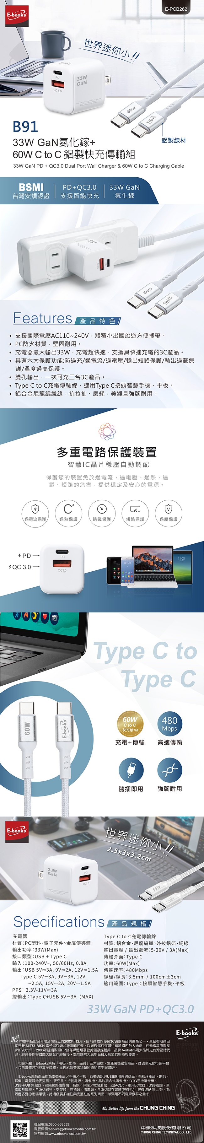 ‧支援國際電壓AC110~240V,體積小出國旅遊方便攜帶。‧PC防火材質,堅固耐用。 ‧充電器最大輸出33W,充電超快速,支援所有具快速充電的3C產品。 ‧具有六大保護功能:防過充/過電流/過電壓/輸出短路保護/輸出過載保護/溫 度過高保護。 ‧雙孔輸出,一次可充二台3C產品。‧Type C to C充電傳輸線,適用所有Type C接頭智慧手機、平板。 ‧鋁合金尼龍編織線,抗拉扯、磨耗,美觀且強韌耐用。
