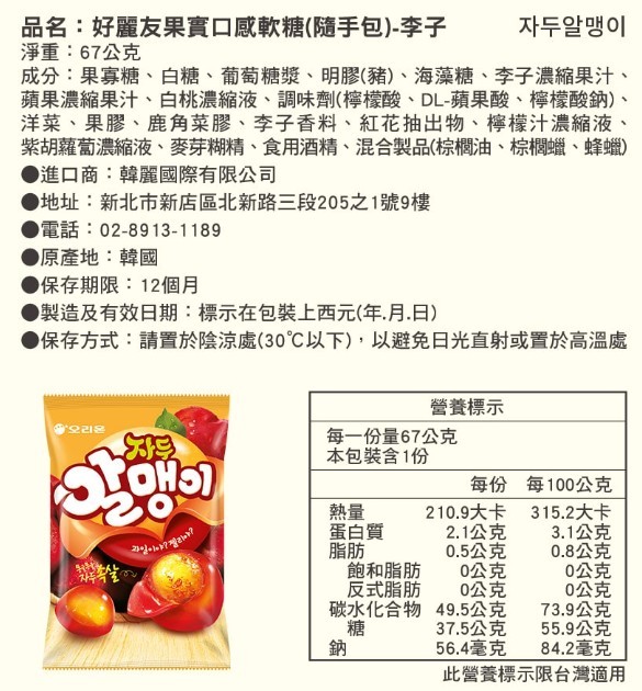 好麗友果實口感軟糖系列/李子/隨手包/67g