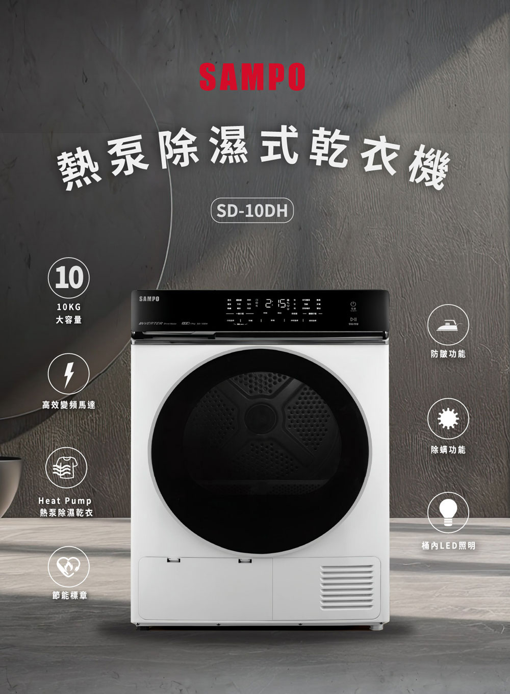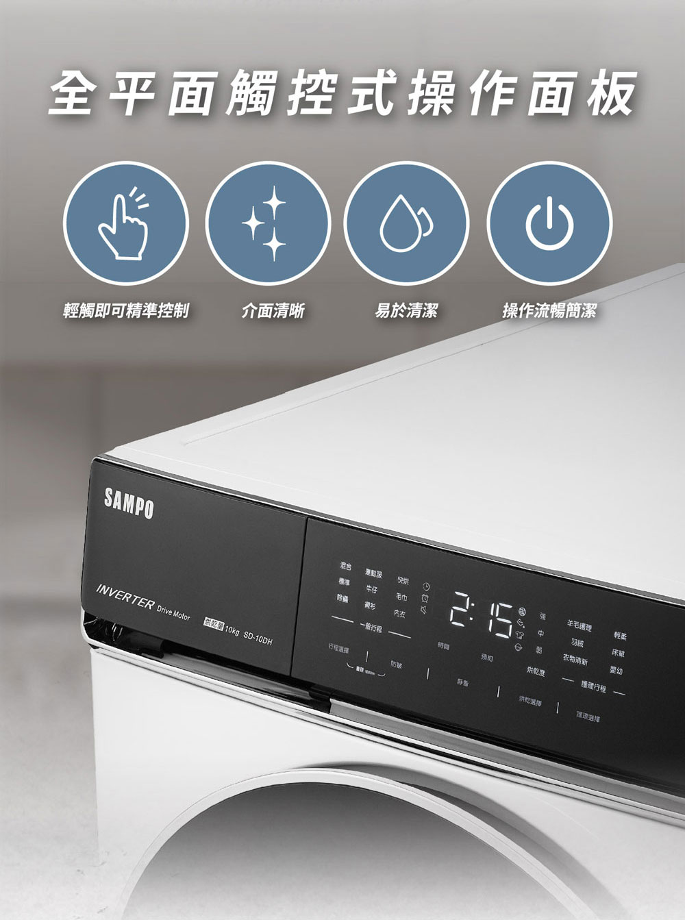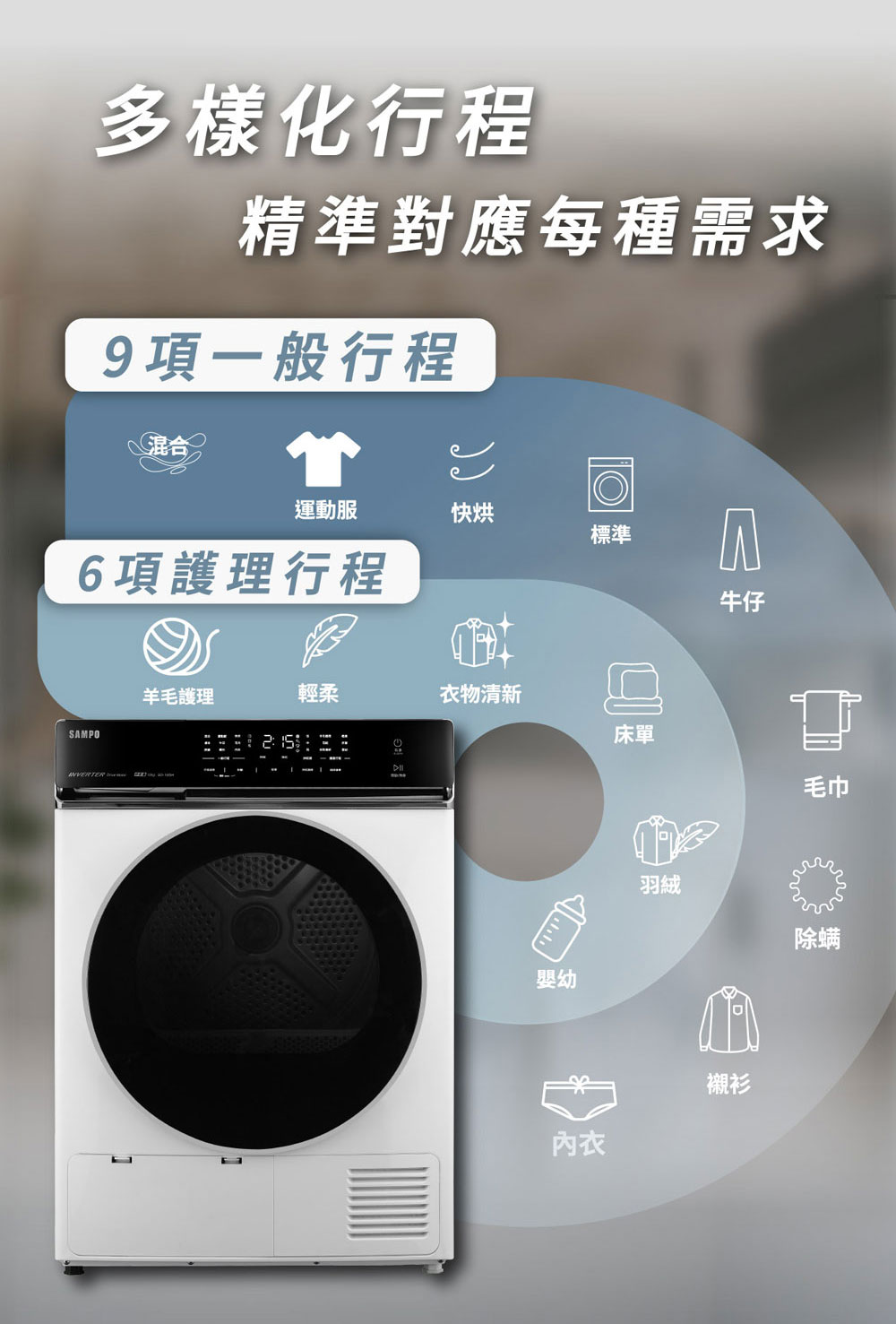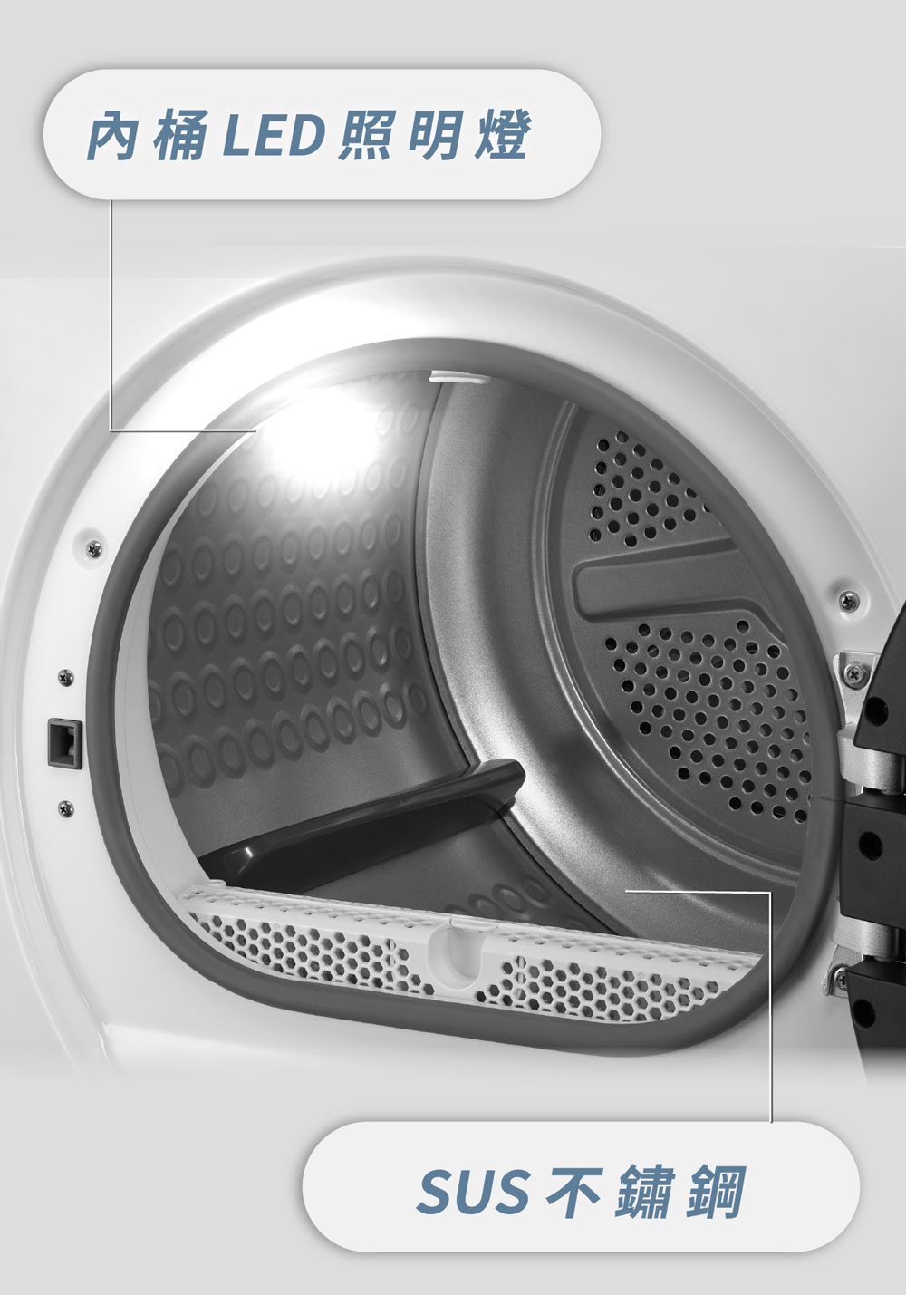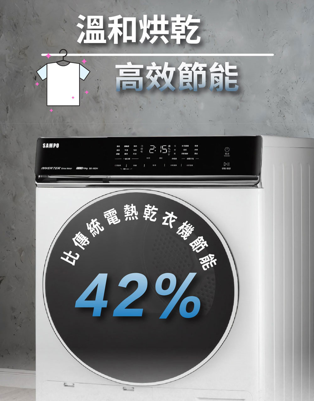 ’熱泵除濕式烘乾衣物不縮水乾衣省電更節能 (較SD-7B省電42%)變頻馬達平面觸控式操作面板衣物清新功能衣物防皺功能除?功能水箱滿水自動提醒過濾網清潔自動提醒烘乾度選擇、內桶LED照明燈9項一般行程 / 6項護理行程