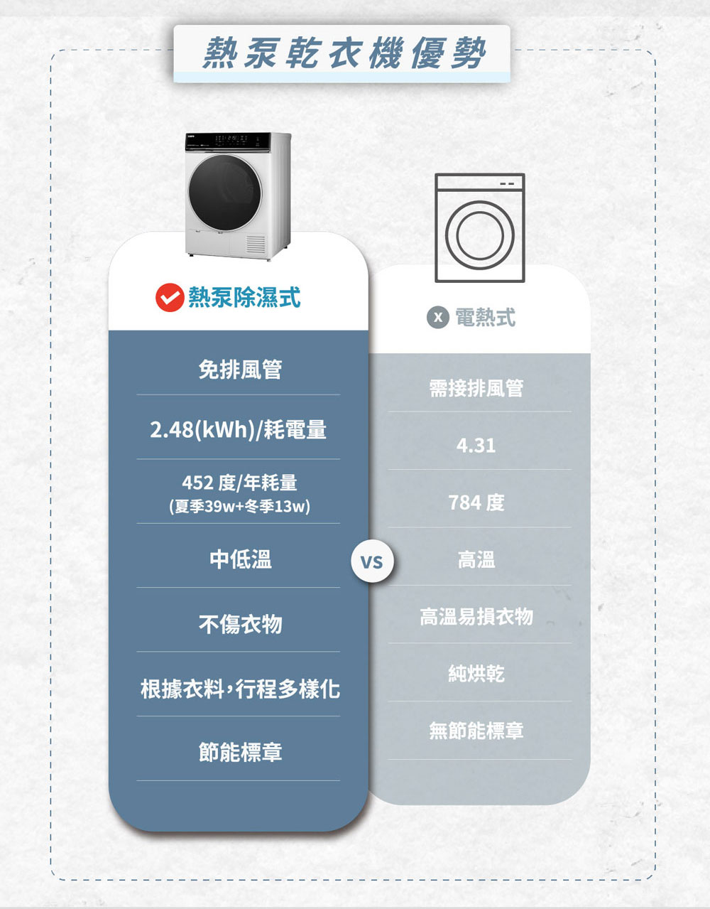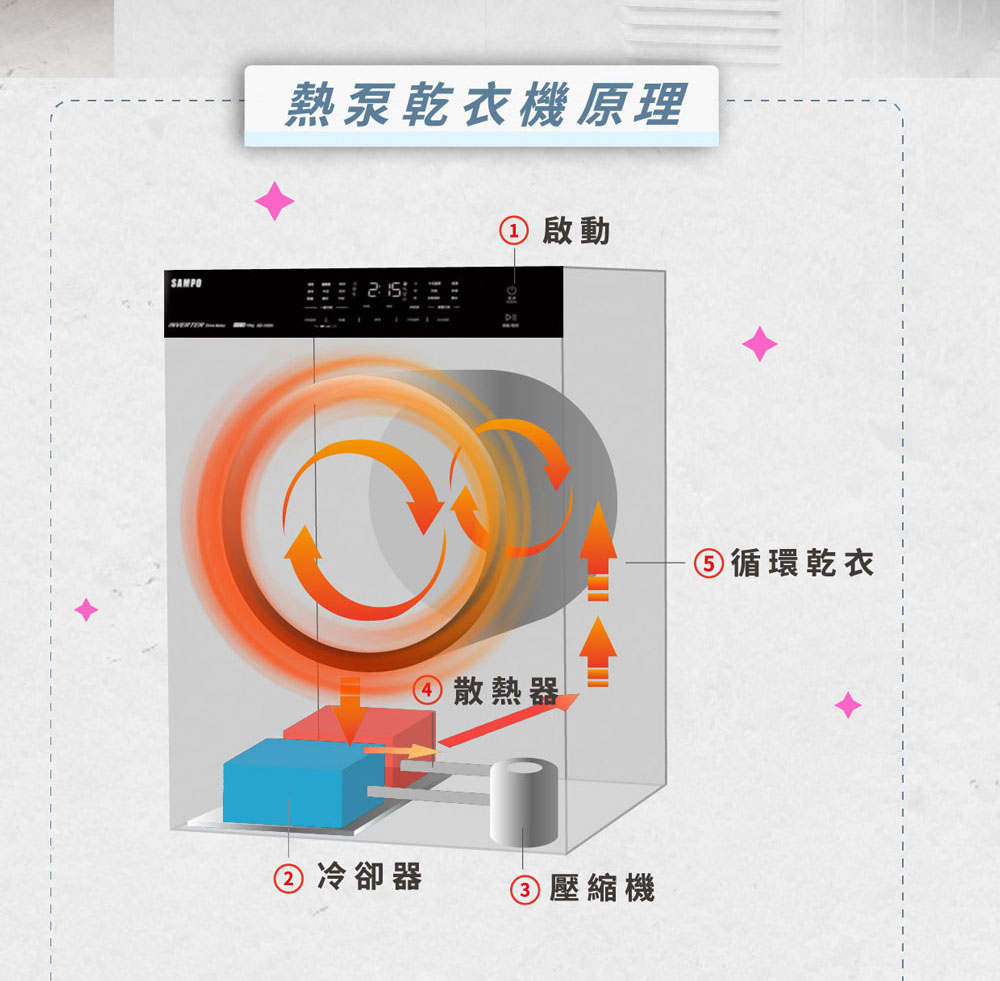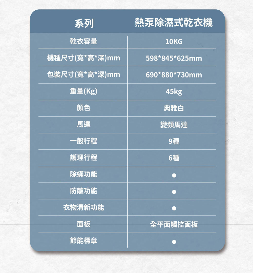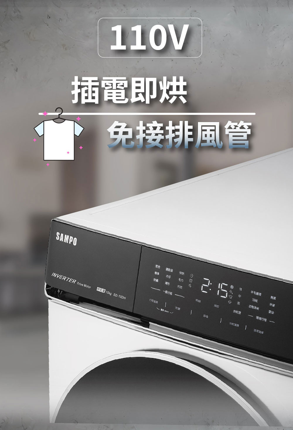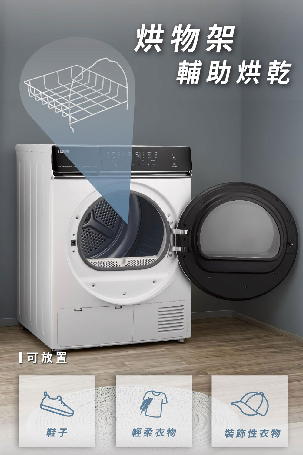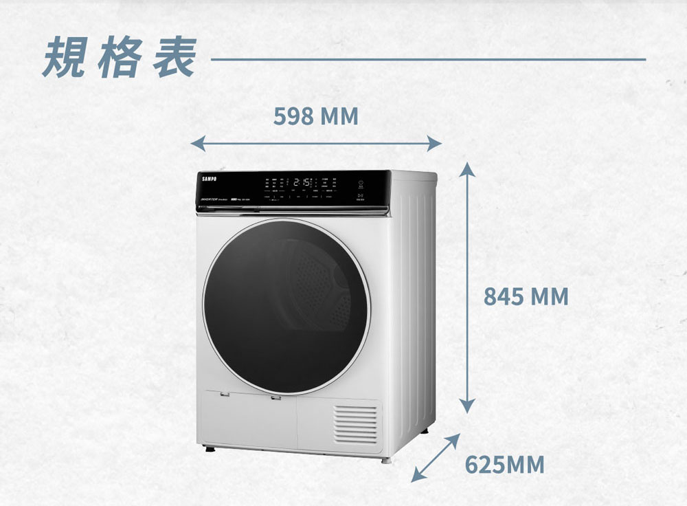 ’熱泵除濕式烘乾衣物不縮水乾衣省電更節能 (較SD-7B省電42%)變頻馬達平面觸控式操作面板衣物清新功能衣物防皺功能除?功能水箱滿水自動提醒過濾網清潔自動提醒烘乾度選擇、內桶LED照明燈9項一般行程 / 6項護理行程